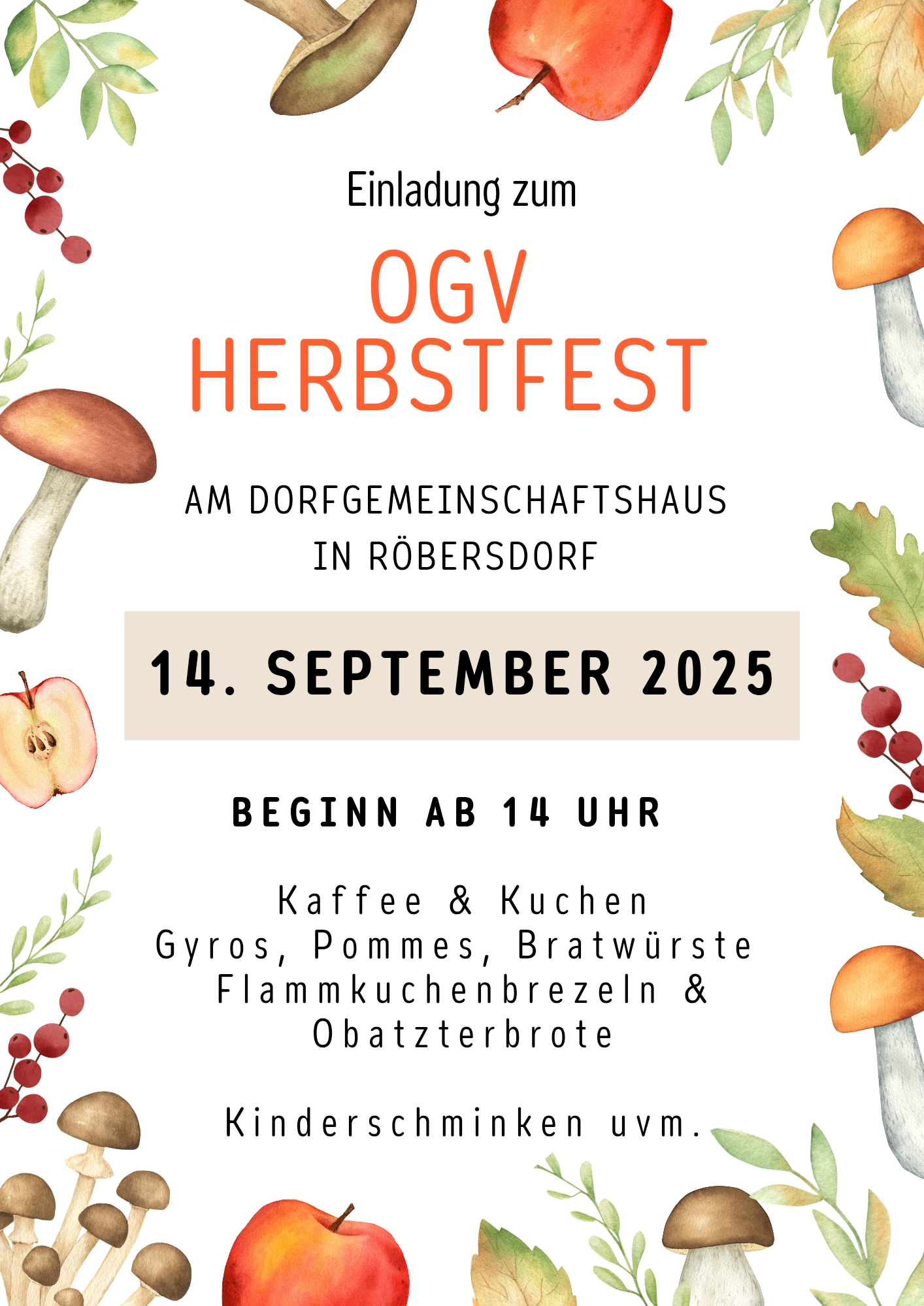 Am kommenden Sonntag, 14. September 2025, veranstaltet der Obst- und Gartenbauverein Röbersdorf e.V. auch in diesem Jahr wieder das traditionelle Herbstfest.
