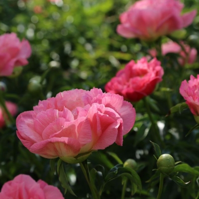 Bereits im April erblüht die in Europa seit alters her als Heilpflanze kultivierte Bauerngarten-Pfingstrose (Paeonia officinalis). Rund zwei Wochen später folgen die ersten Sorten aus der Gruppe der Edel-Pfingstrosen (Paeonia-Lactiflora-Hybriden), deren Elternarten aus China stammen. Eine große Sortenvielfalt lässt inzwischen kaum noch Wünsche offen: Von einfachen bis dicht gefüllten Blüten erstrahlt eine Farbpalette von Tief Dunkelrot über Rosa und Magenta bis Weiß. Wer geschickt plant, kann den Blütenreigen in seinem Garten unter günstigen Bedingungen bis zum Juni ausweiten.