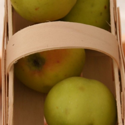 Frucht bei Reife grüngelb, etwas gerötet, Schale hart, glatt, fettig, Fruchtfleisch fast weiß, mürbe