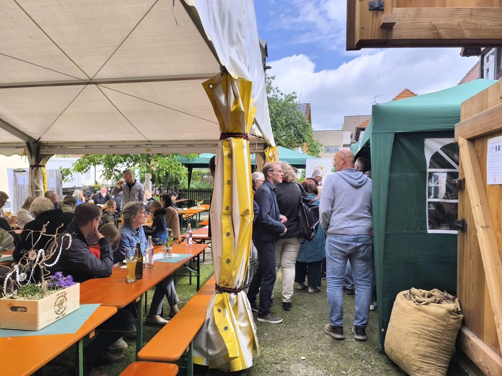 Gut besucht verteilten sich alle Gäste drinnen wie draußen und genossen teils bei Sonnenschein Kaffee und Kuchen. Hier bot sich die Gelegenheit, sämtliche Fragen zur Bepflanzung von Hochbeeten mit erfahrenen Gärtnerinnen und Gärtnern zu stellen, sich zur Gartengestaltung beraten zu lassen und ein paar Tipps einzuholen, z.B. welche Gemüse- bzw. Pflanzensorten in einem Beet zusammen passen und weshalb die Nutzung von Torf im eigenen Garten woanders die Lebensräume vieler Pflanzen und Tiere zerstört und schlecht fürs Klima ist.