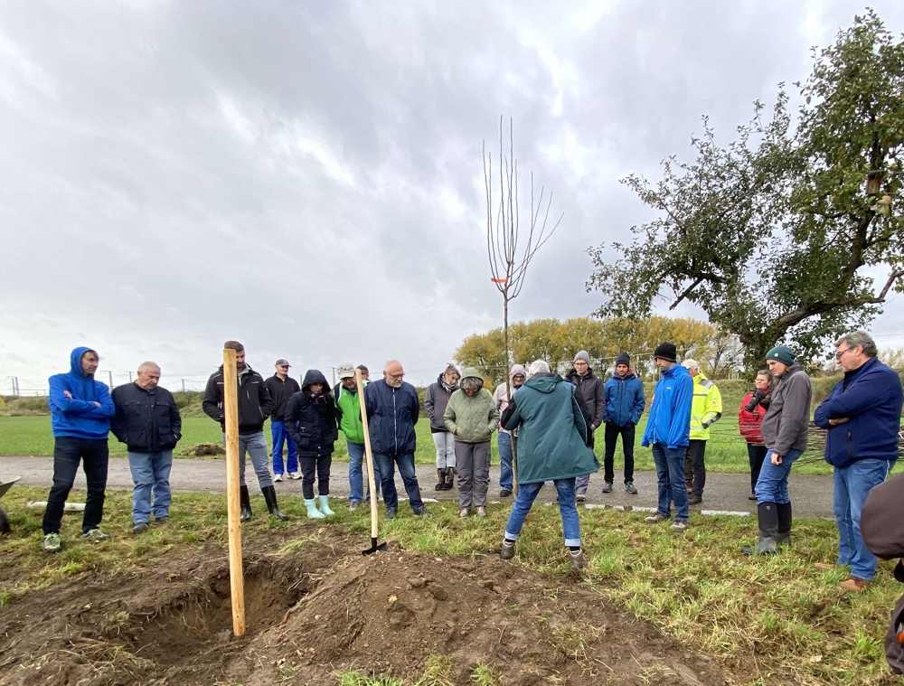 Im Anschluß ging es zum praktischen Teil der Schulung in die historischen Allee: Unter fachkundiger Anleitung wurden verschiedene Bäume in Planzlöcher mit unterschiedlicher Bodenbeschaffenheit gepflanzt. Pflanztiefe, Wühlmausschutz, Anmähschutz und richtige Länge der Pflanzpfähle wurden genauso erkärt, wie Baumausrichtung, Wurzelbeschnitt und Pflanzschnitt der Baumkrone. Bei „regnerischen Pflanzwetter" halfen viele fleißige Hände, bis alle Hochstammbäume gepflanzt waren.
